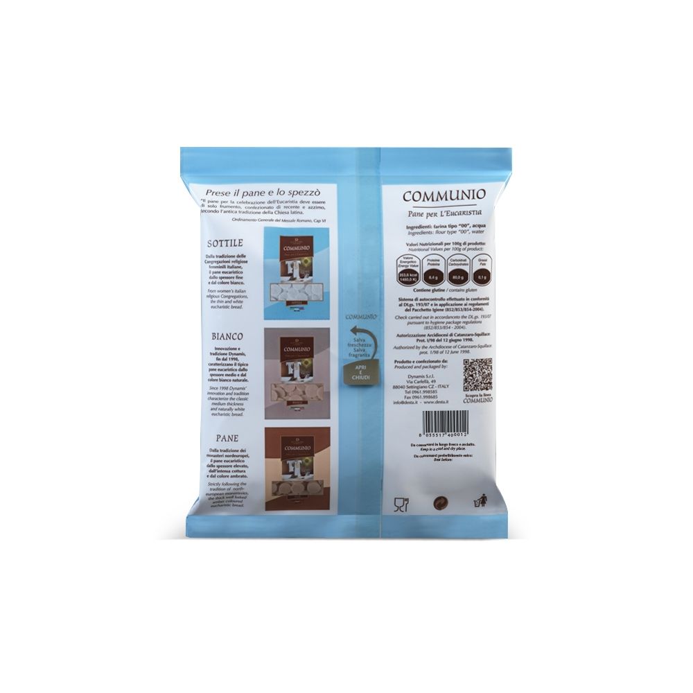Procedente de la tradición de las Congregaciones religiosas femeninas italianas, el Pan Eucarístico COMMUNIO, de fino espesor y color blanco, se elabora únicamente con harina seleccionada de tipo «00» (NO OGM) y agua, respetando plenamente las normativas vigentes en materia de elaboración de productos alimenticios y las normativas higiénico-sanitarias, siguiendo siempre rigurosamente los dictados del Código de Derecho Canónico, con el fin de ofrecer a los consumidores una garantía de calidad, autenticidad y tradición clerical.